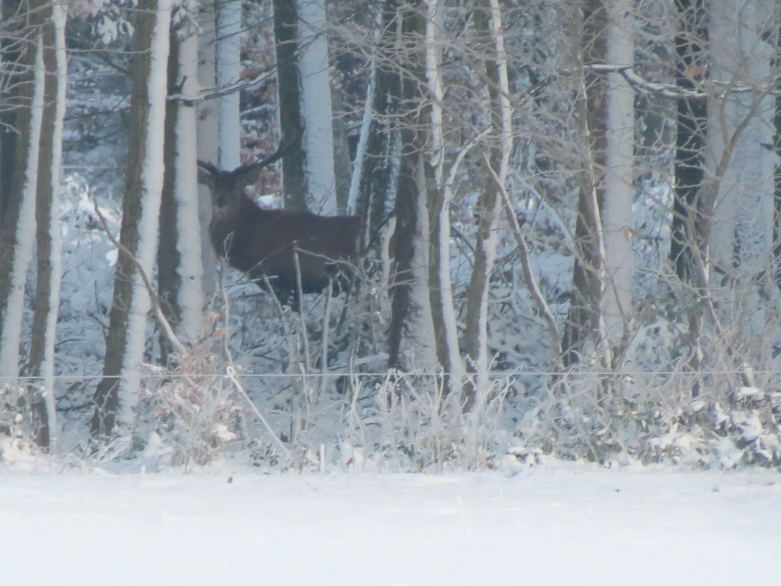 Hoewel de verleiding zeer groot was om te blijven liggen vanmorgen, heb ik toch maar de stoute schoenen (beter gezegd bontlaarzen) aangetrokken. Zes lagen bovenkleding verder ben ik op de fiets gestapt. Al snel wist had ik geen spijt meer. Wat een stilte!! De weinige geluiden die er waren, werden gedempt door de sneeuw. Een schitterend sneeuwdek versiert de Veluwe. In het halfdonker glibber ik op de onbestrooide en ongerepte paadjes. Op een pad staat een ree. Hij maakt zich uit de voeten als hij mij ziet. Genietend van de opkomende zon fiets ik door het steenkoude bos. Hoewel je zou verwachten om een poolvos en een ijsbeer te ontdekken, staat er zowaar een mooi edelhert in de dekking van een bos. Wel een kwartier hebben we elkaar aan staan de kijken. Hij verroerde zich nauwelijks, ik ook niet. Enkele foto's kon ik maken. Leuk. Omdat hier het fietsen te zwaar werd (stadsfiets:)) ging ik maar een stukje lopen. Heerlijk. Er lag nog zeker twintig centimeter sneeuw. Het sneeuw knerpte onder mijn laarzen. Ik bevond me in een idyllisch boek!! Enkele reeën hadden mij allang ontdekt voordat ik hen zag. In een rustig tempo zochten zij een veilig heenkomen. Verder was het weinig qua wild. Wel veel prenten, mooie sneeuwwissels en gewroet. Totdat.....ik het ultime moment van de morgen beleefde. Een mooi hert stak een weiland over. Dat wordt DE sneeuw wildfoto dacht ik. Ik remde (met voorrem) en bleef ternauwernood op de been, handschoenen uit, fiets neer gegooid, camera aan, inzoemen en..........klik, klik, klik. Hert weg! In de bossen klonk alleen nog gekraak. Al deze consternatie hebben ervoor gezorgd dat de enige foto bijna mislukt is. Maar toch.....een hert in de sneeuw! Genietend van de natuurpracht fietste ik huiswaarts. De bospaden waren niet meer te onderscheiden, gelukkig weet ik de weg, maar fietsen in zo'n sneeuwmassa is echt topsport. Gelukkig had ik daardoor al snel geen last meer van de kou. Thuisgekomen begon ik te gloeien tot laat in de middag. Heerlijke start van de dag. Omdat woorden tekort schieten om deze belevingen weer te geven, doe ik hierbij een aantal foto's, al kunnen die ook het gevoel niet verhalen.